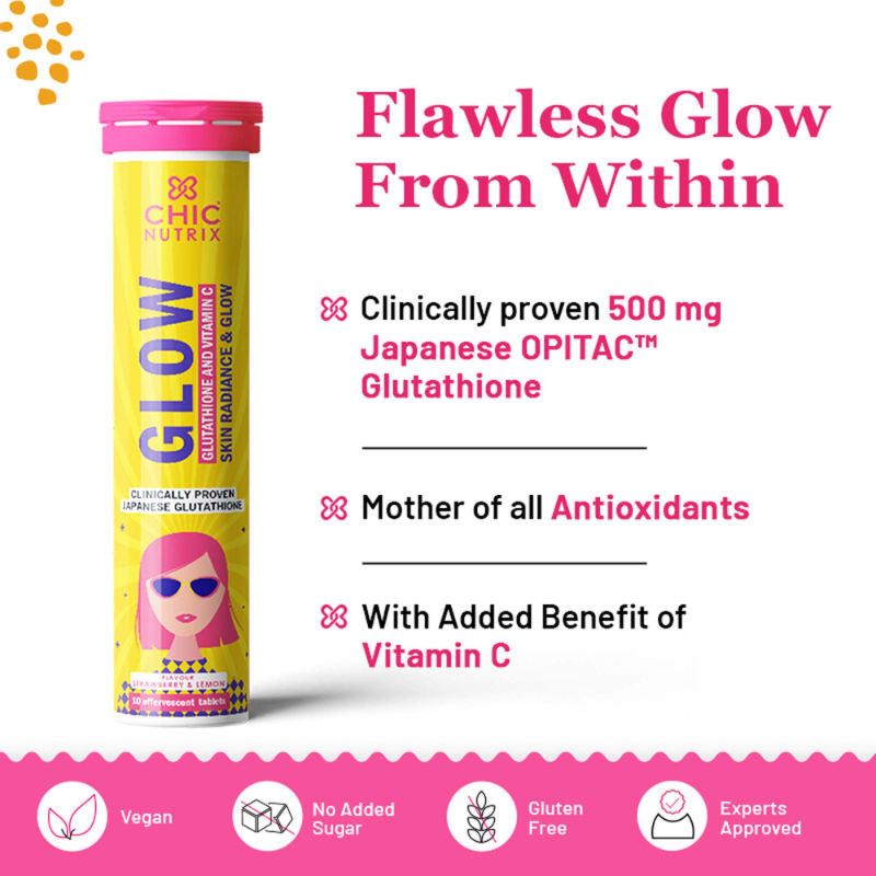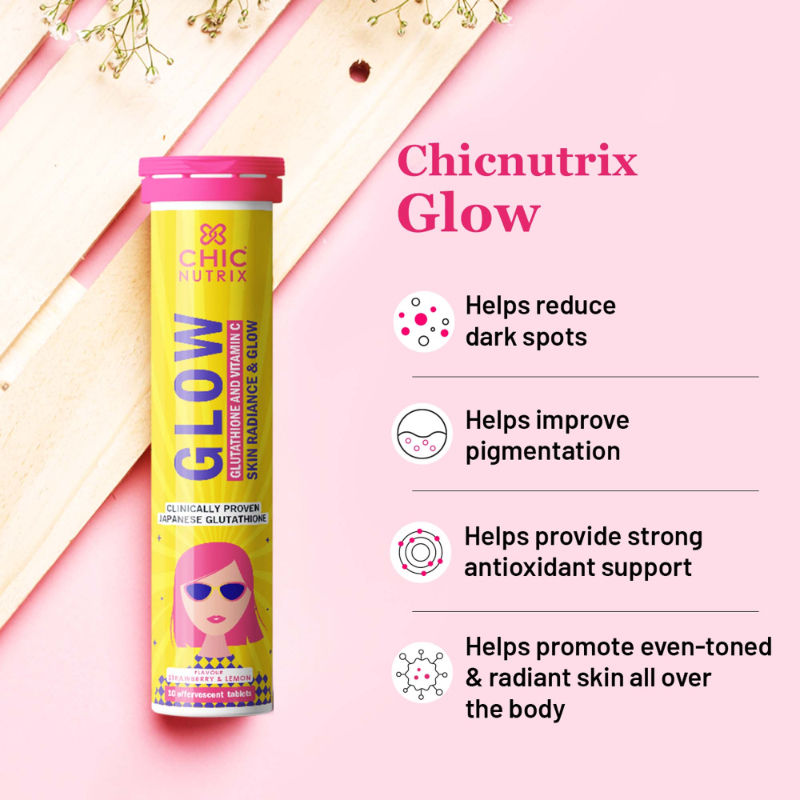 - Chicnutrix Glow is a beauty nutrition supplement formulated with a combination of 500 mg glutathione and 40 mg vitamin C for a convenient and effective skin glow and radiance.