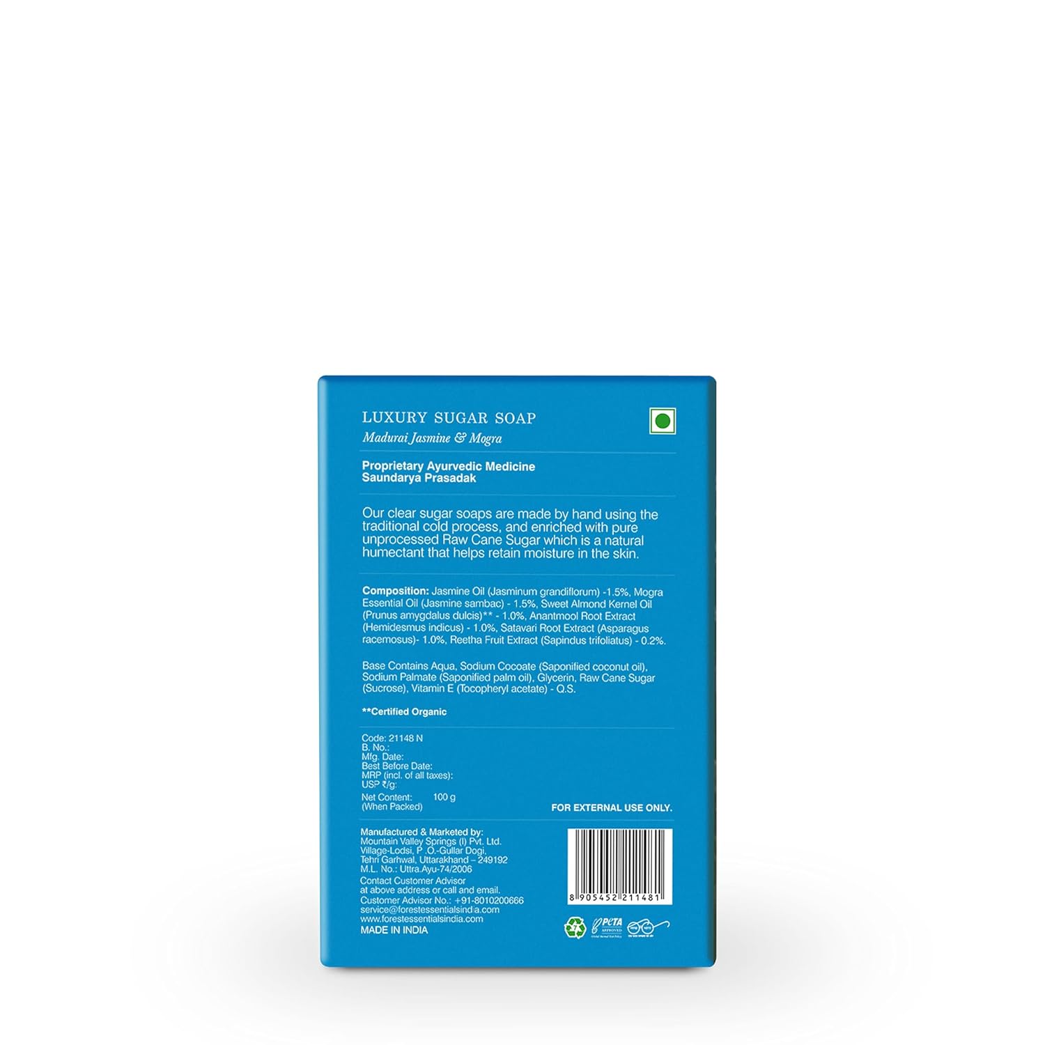 - This Ayurvedic soap is infused with the pure essential oil of Mogra and Jasmine, sourced from Madurai, to lightly scent the skin.