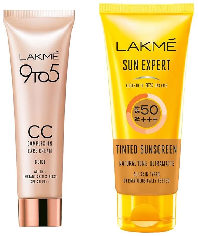 Lakme 50 SPF Sun Expert Tinted Sunscreen Cream 50 gms & Lakme 9 to 5 CC Cream Mini, 01 - Beige, SPF 30 , 9 gms