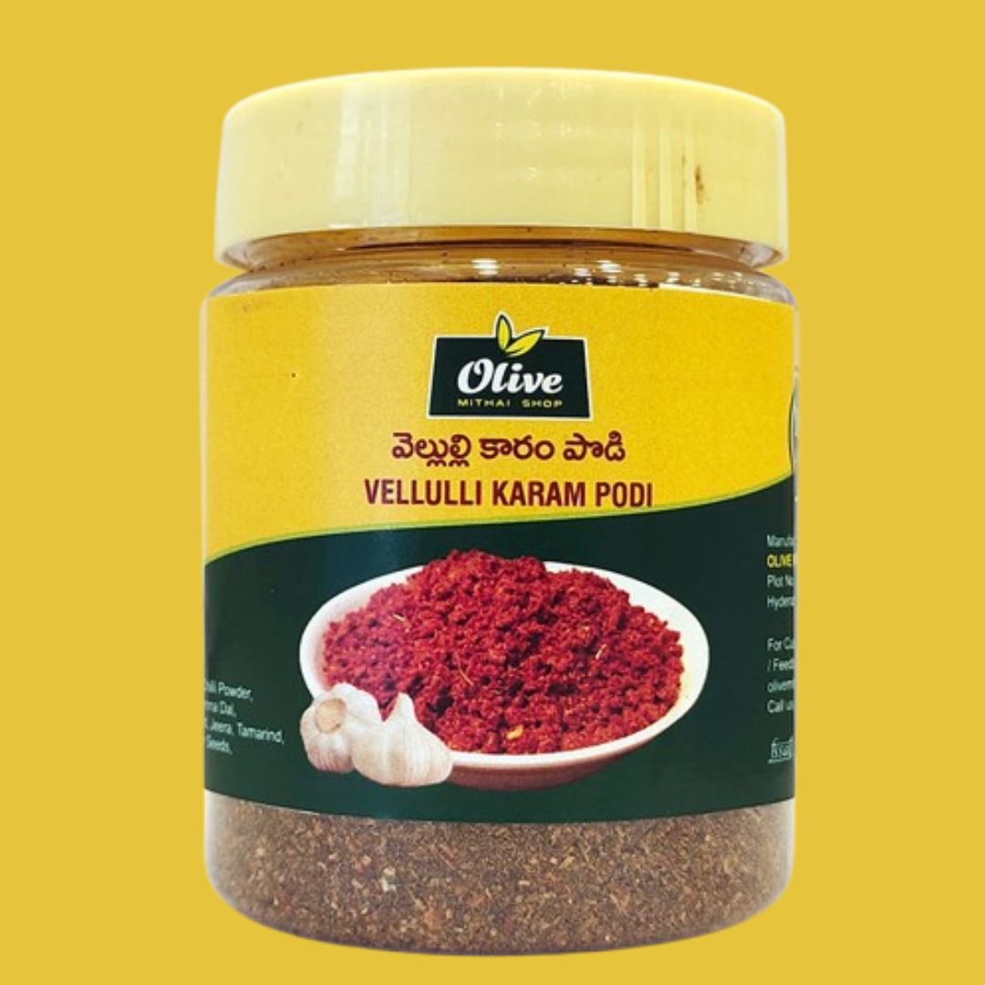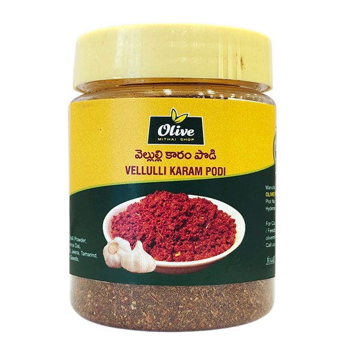 - Olive Mithai Shop Vellulli karam podi is a spicy dry powder made with garlic and red chili peppers, typically used as a seasoning in South Indian cuisine.