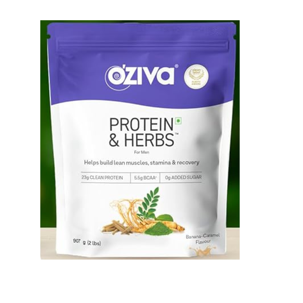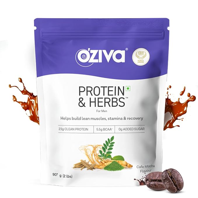 - OZiva Protein & Herbs for Men packs 23g Certified Clean Protein (cold-processed whey protein) necessary for muscle building and repair.