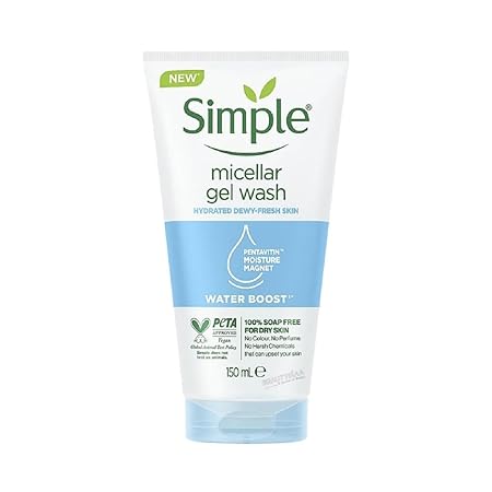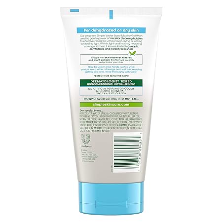 - Simple Water Boost Micellar Facial Gel Wash with micellar cleansing bubbles, gently yet effectively cleanse your face, removing dirt and make-up.