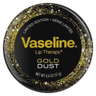- Vaseline Lip Therapy Gold Dust Limited Edition Lip Balm Tin helps to lock in moisture for beautiful, healthy lips Peach-tinted lip balm with golden sparkles, scented with white pear & chamomile For Shimmering, Precious Lips Lip Therapy tins give lips a natural, glossy shine